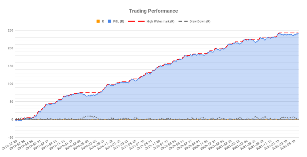 The backtest shows an average win rate of 45% with a 1:2 risk-to-reward ratio. This means the strategy is profitable, but can have periods of drawdown, that you will need to trade through.